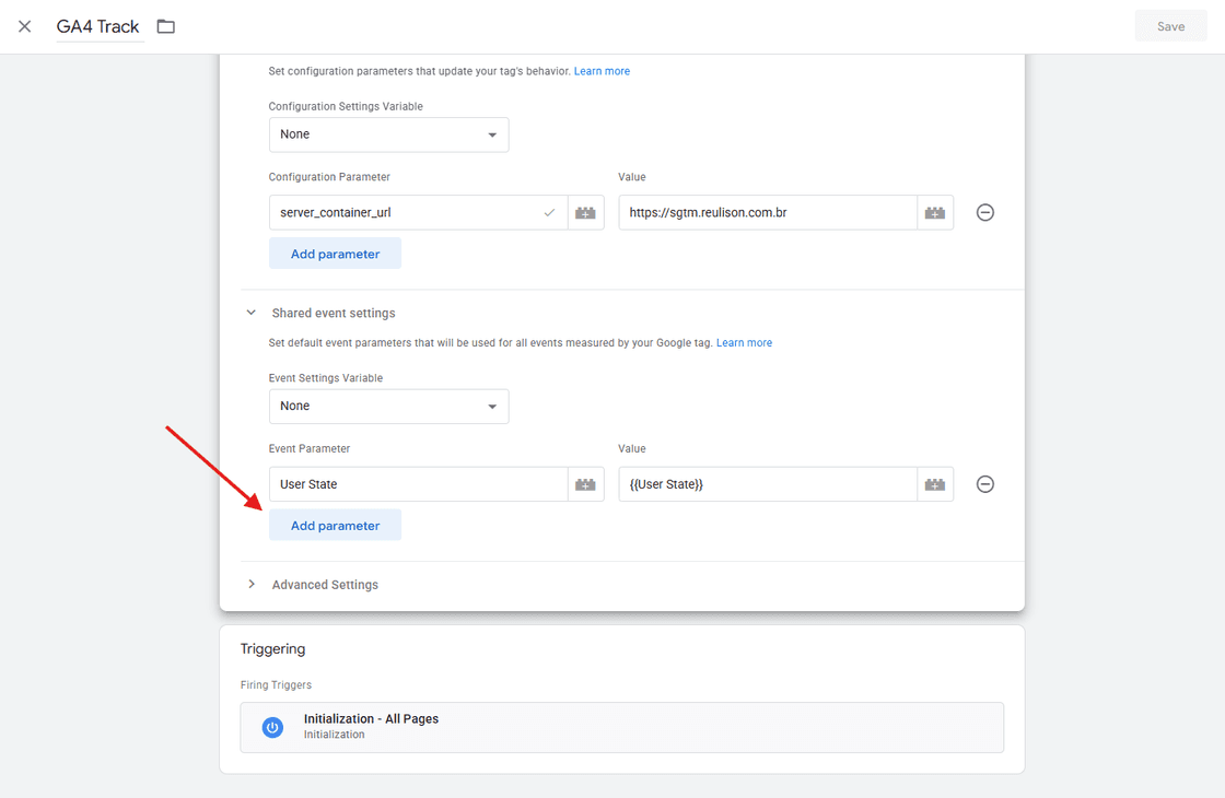 Passo 3: Vá até Shared event settings e adicione um novo Event Parameter.