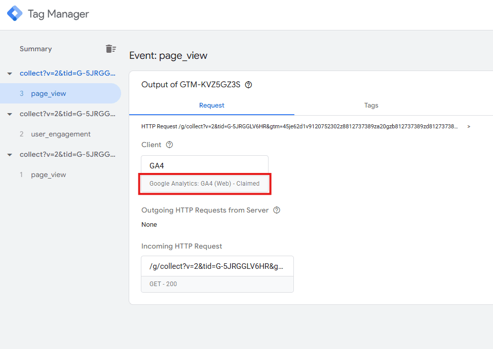 Passo 5: Ao mesmo tempo, coloque o contêiner GTM do lado do servidor no modo Preview e você deverá ver a solicitação via cliente do GA4, conforme mostrado abaixo.
