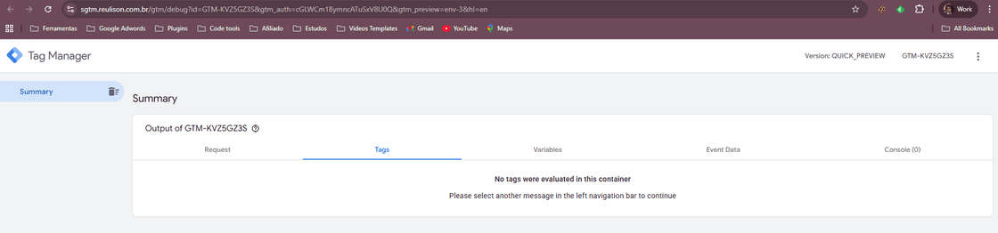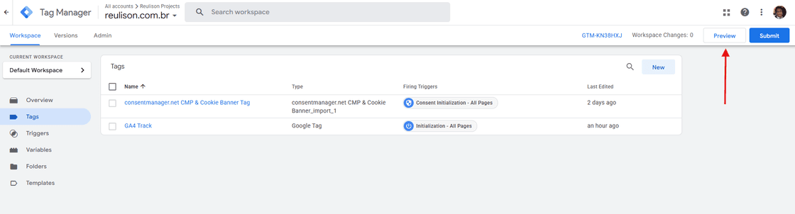 Passo 5: Navegue até o seu GTM web e clique no botão Preview: